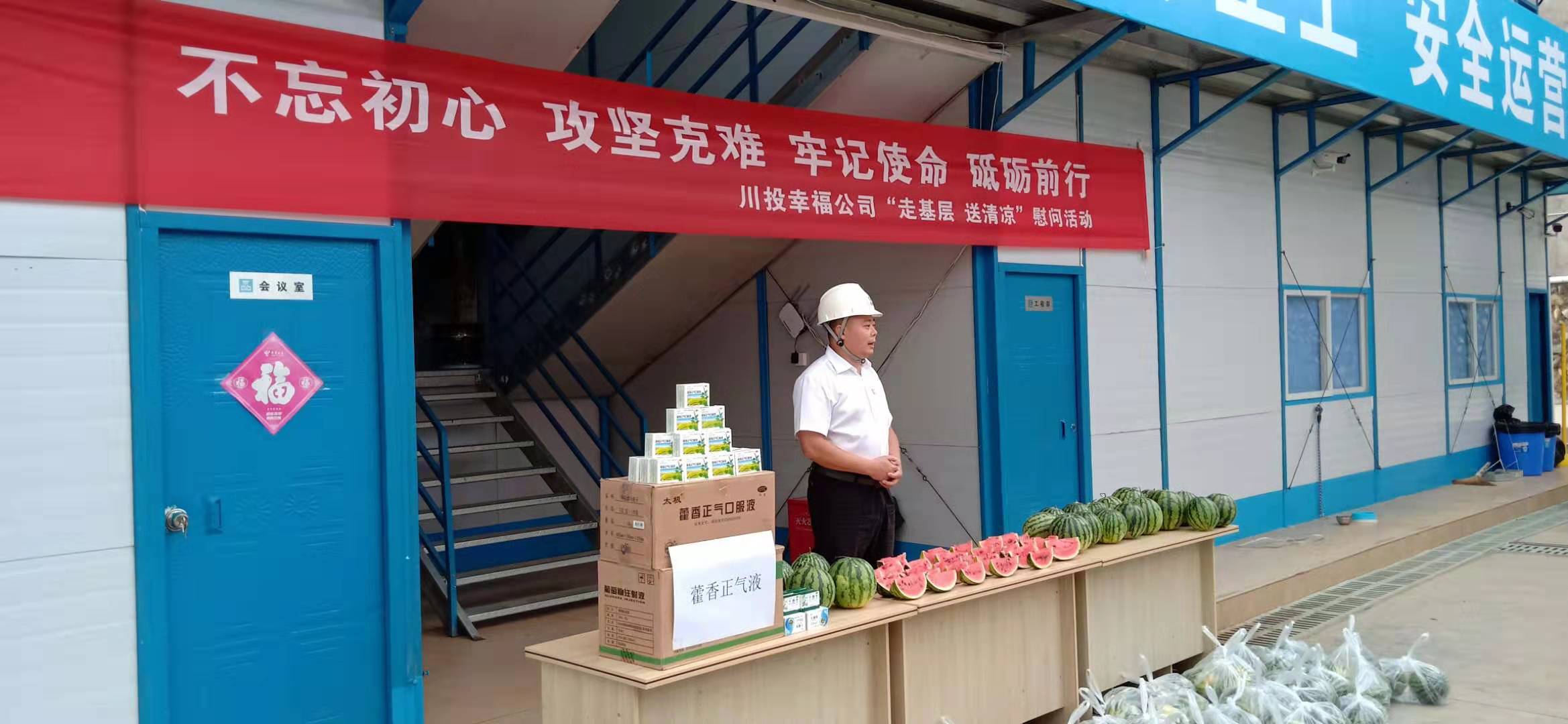 为践行集团公司“双转双促”活动要求,推动实施“双争双百”计划,回应项目施工一线民工诉求,营造安全、和谐的共建共享氛围,7月23日,房地产公司党支部副书记、总经理张碧波在米易“时光水街”项目建设现场参加川投幸福公司“不忘初心攻坚克难 牢记使命 砥砺前行”走基层送清凉慰问活动。本次慰问以参建各方一线民工、施工管理人员为主,活动发放了西瓜、藿香正气液、十滴水等防暑降温用品,获得参建各方一致好评。