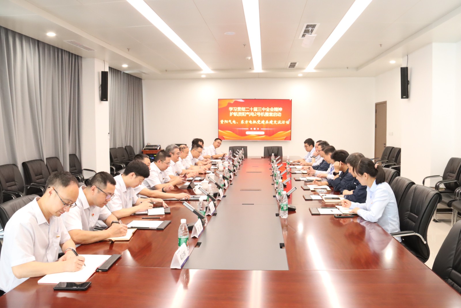 为深入学习贯彻党的二十届三中全会精神,总结资阳燃机项目创争联动活动经验及成果,充分发挥党建引领作用,推动党纪学习教育走深走实,为资阳燃气电站2号机组整套成功投运保驾护航,8月9日,资阳气电、东方电机组织开展党建共建交流活动。活动由川投燃电党委委员、副总经理,资阳气电党支部书记、执行董事、总经理梁红兵主持,东方电气集团东方电机有限公司副总经理范先忠出席活动。