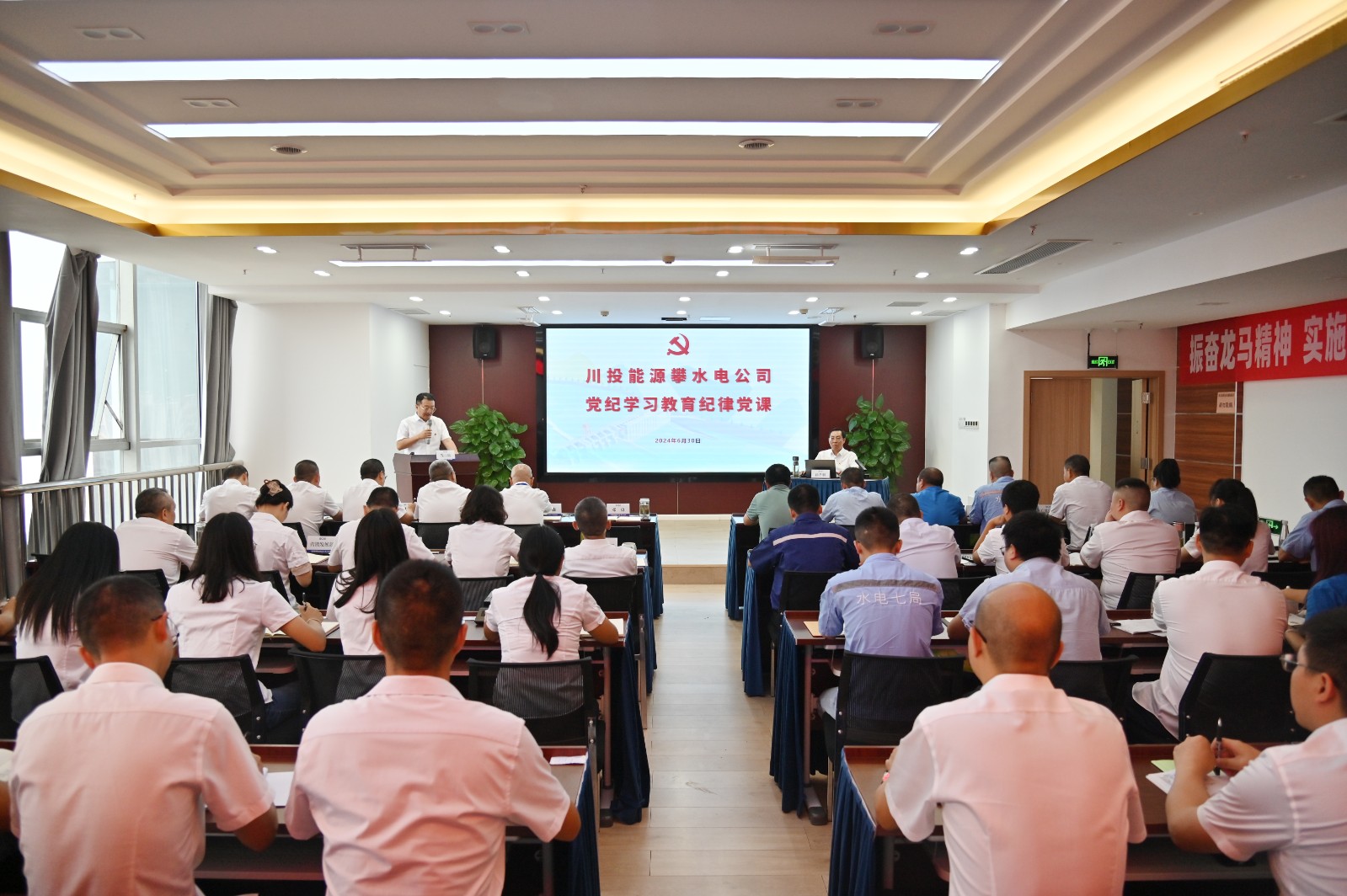 在全党开展党纪学习教育和党的103岁生日来临之际,按照川投能源党委和攀水电党总支的安排部署,6月30日上午,川投能源副总经理、攀水电公司党总支书记、董事长徐孝刚讲授了党纪学习教育纪律党课并宣讲省委十二届五次全会精神,公司全体员工、参建单位负责人及党员代表共计50余人参加。