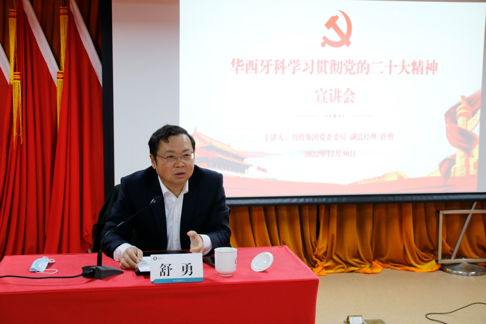 12月30日上午,集团公司党委委员、副总经理舒勇赴华西牙科开展学习贯彻党的二十大精神专题宣讲。会议由华西牙科党委书记、董事长刘凌云主持。